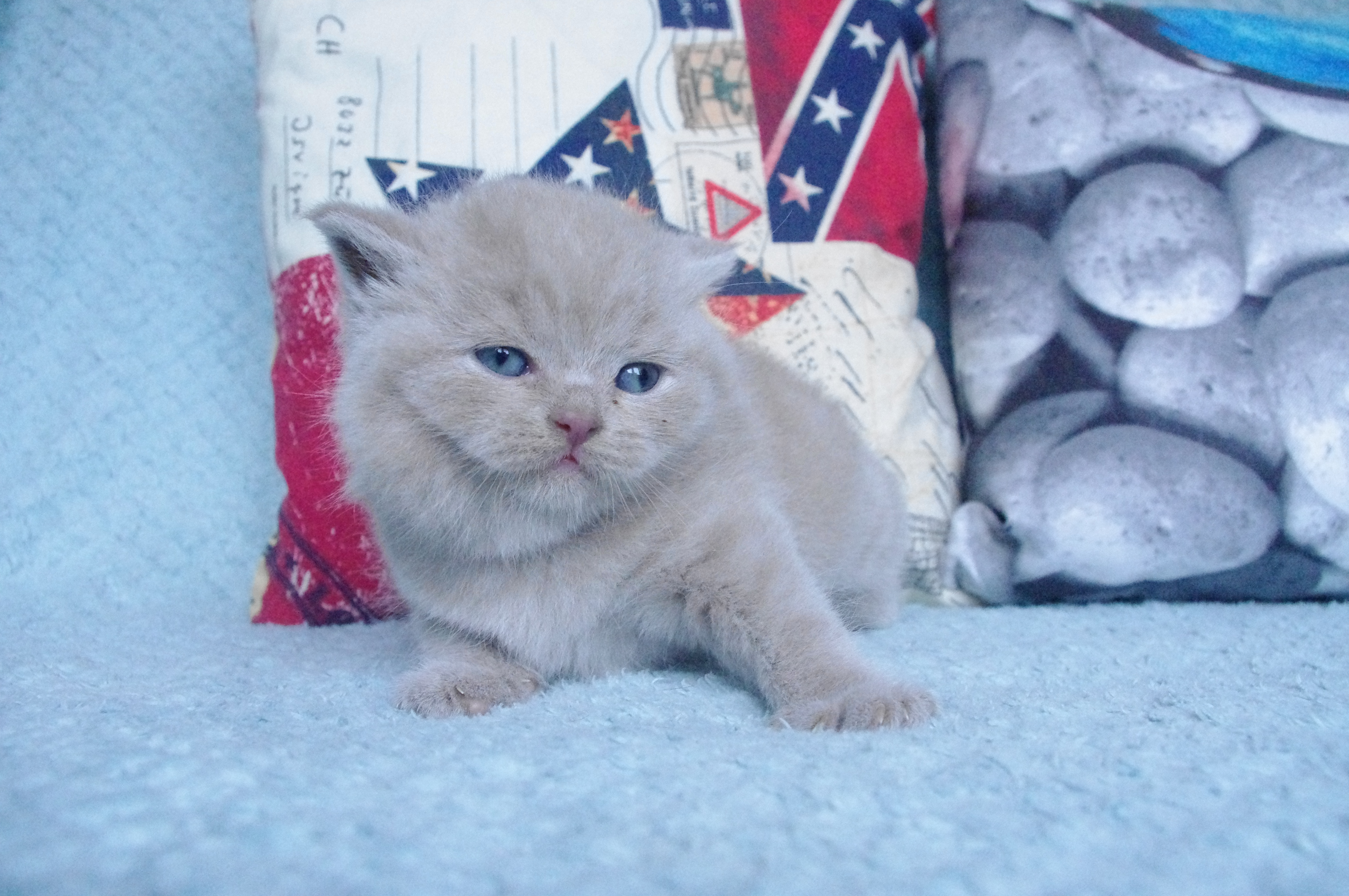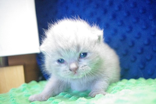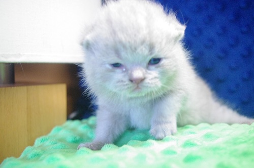materiałowe legowisko, i nieźle pogryzł styropianową piłeczkę. Kociaki mają wstawioną miseczkę z suchą bardzo drobniutką karmą i myślę, że dzięki tym niesfornym zębom, Cappuccino za chwilę zacznie ją chrupać.