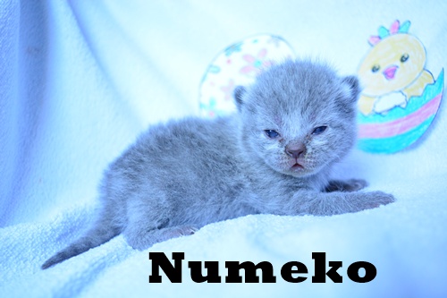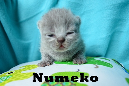 | Numeko jest małą kruszynką w miocie. Ma piękne jasne futerko i nie lubi być sama. Zawsze gdy odpełznie nieco od kociej mamy i rodzeństwa, zaraz słychać jej "miau". Jest malutka, ale głosik ma donośny. Jak się obudzi, też oznajmia to swoim słodkim "miau". |